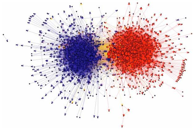 This figure summarizes the link structure within a community of political blogs (from 2004), where red nodes indicate conservative blogs, and blue liberal. Orange links go from liberal to conservative, and purple ones from conservative to liberal. The size of each blog reflects the number of other blogs that link to it